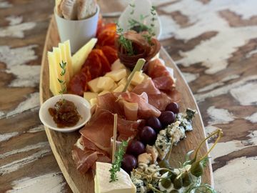 Quesos manchego, gouda, azul, cabra, jamón serrano, mortadela, salami picante, cebollitas, pepinillos, dijon, cebolla caramelizadas, miel de trufa, pepperoncino y pan • Charcuterie board with manchego, gouda, blue, and goat cheese, serrano ham, mortadella, spicy salamy, pearl onions, gherkins, dijon, carmelized onions, truffle honey, pepperoncino and bread
