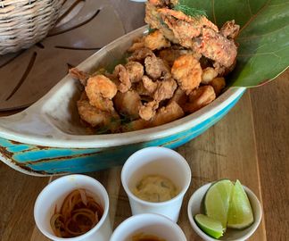 Crujientes de pescado y mariscos de temporada acompañados, con salsa tártara y salsa criolla • Crispy pieces of fish and in season seafood accompanied tartar sauce and salsa criolla, onions, cilantro, lime & tomatoes